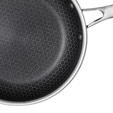 Our signature technology: A laser-etched stainless steel hexagon design. This network of ridges forms peaks over nonstick valleys, boosting your searing power.