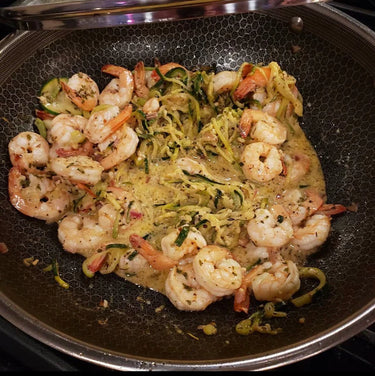 Das heutige Abendessen besteht aus cremigen Zitronen-Knoblauch-Garnelen und Zoodles, zubereitet im @hexclad-Wok. Ich liebe dieses Gericht und diese Pfanne!