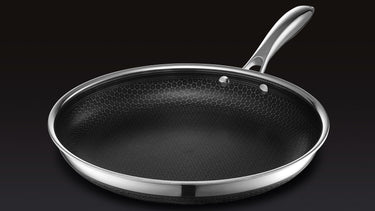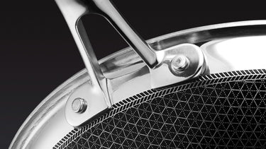 We’ve used a layer of magnetic stainless steel (compatible with gas, electric, and induction cooktops). Steel is tough-as-nails and provides lasting durability so HexClad can be the last pan you buy.